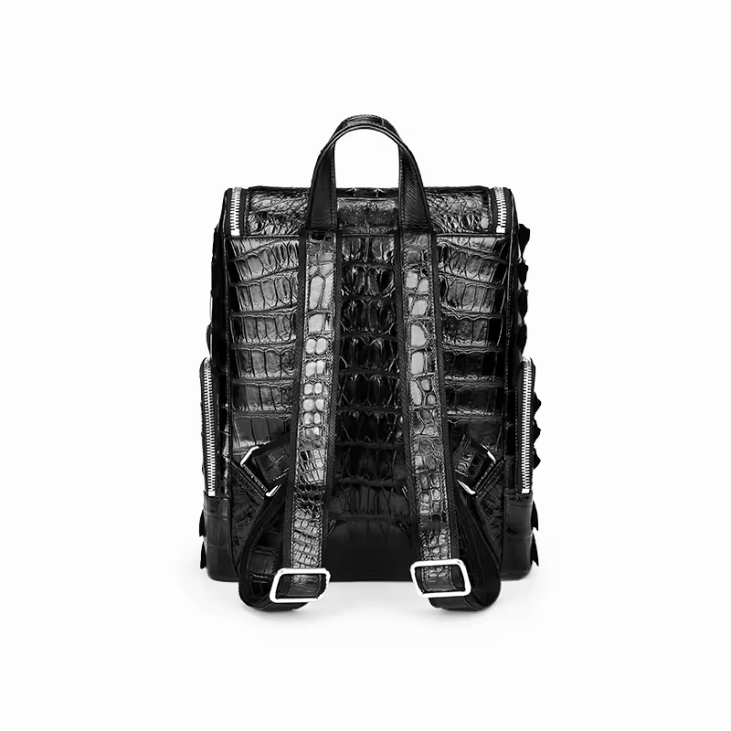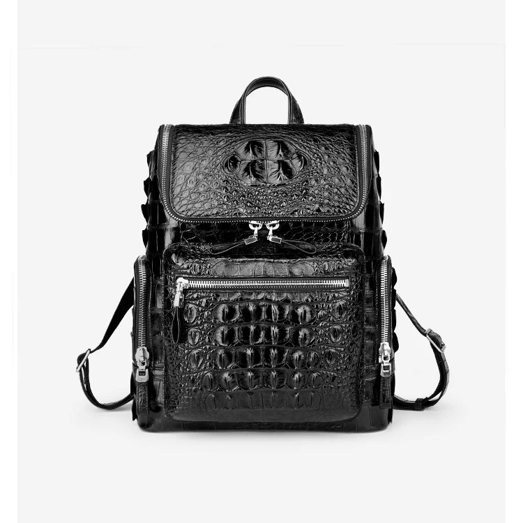 Black leather men's travel backpack made of crocodile skin.