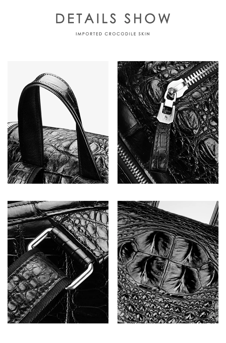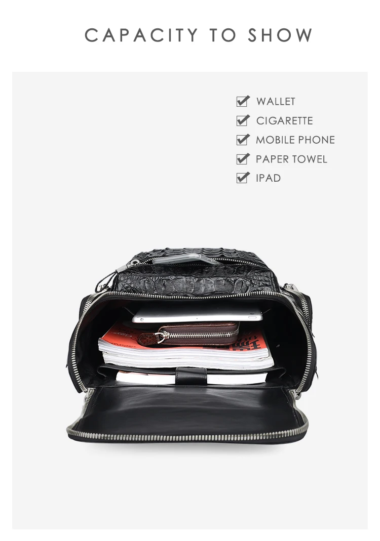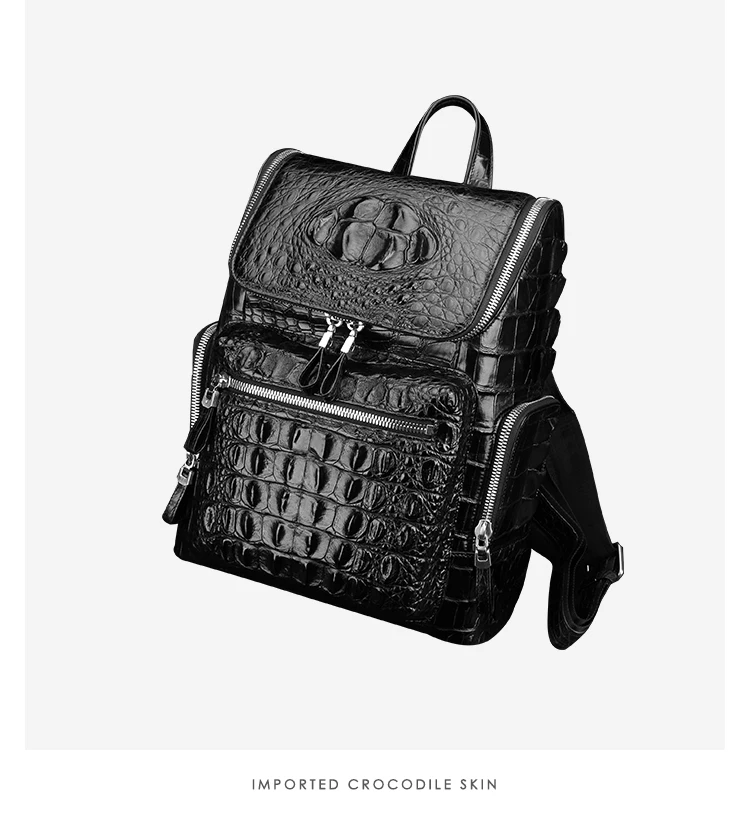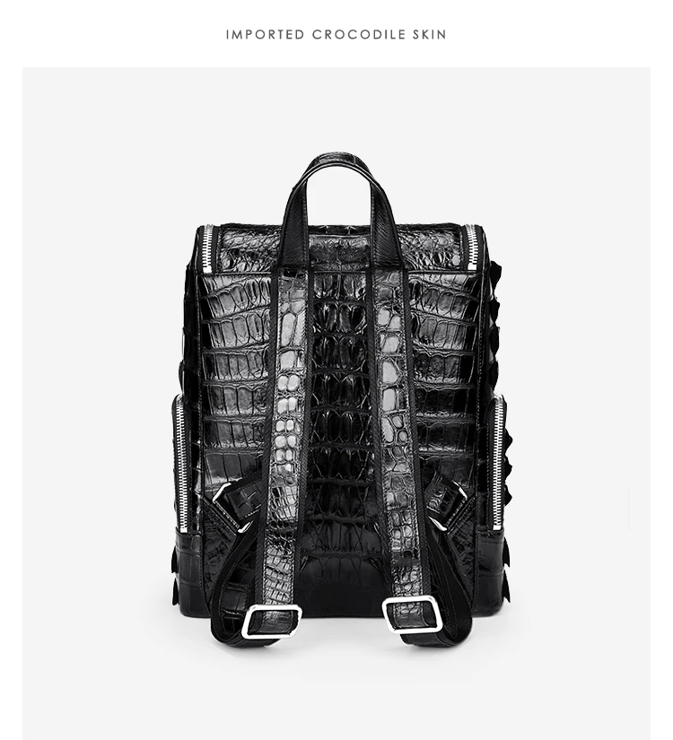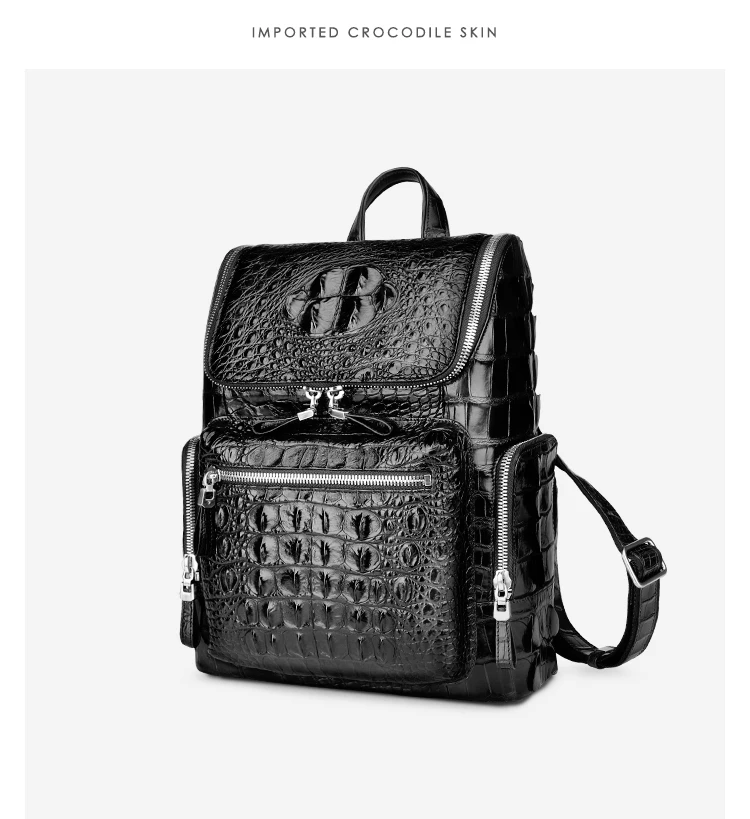 • Black leather men's travel backpack made of crocodile skin.
